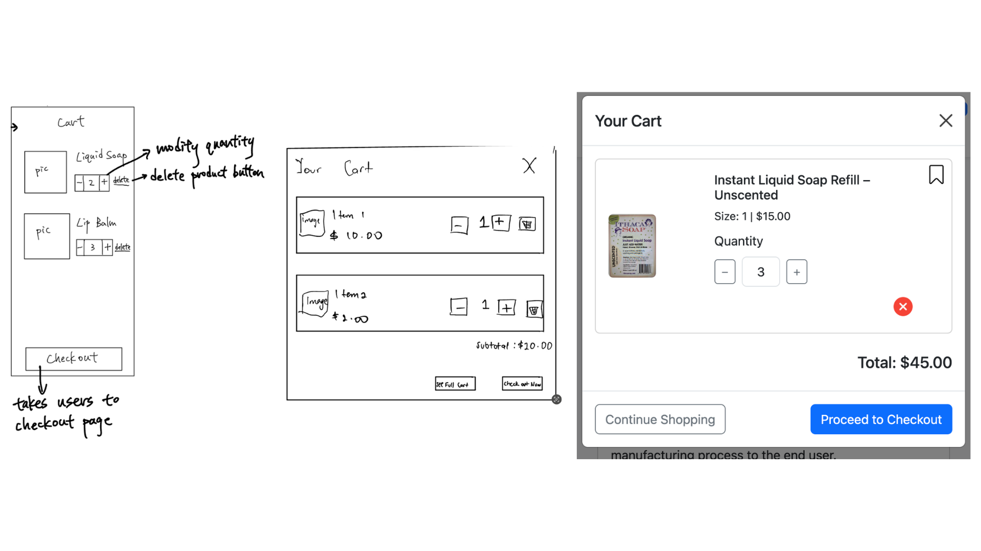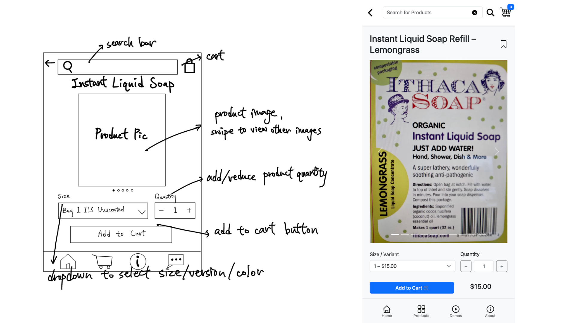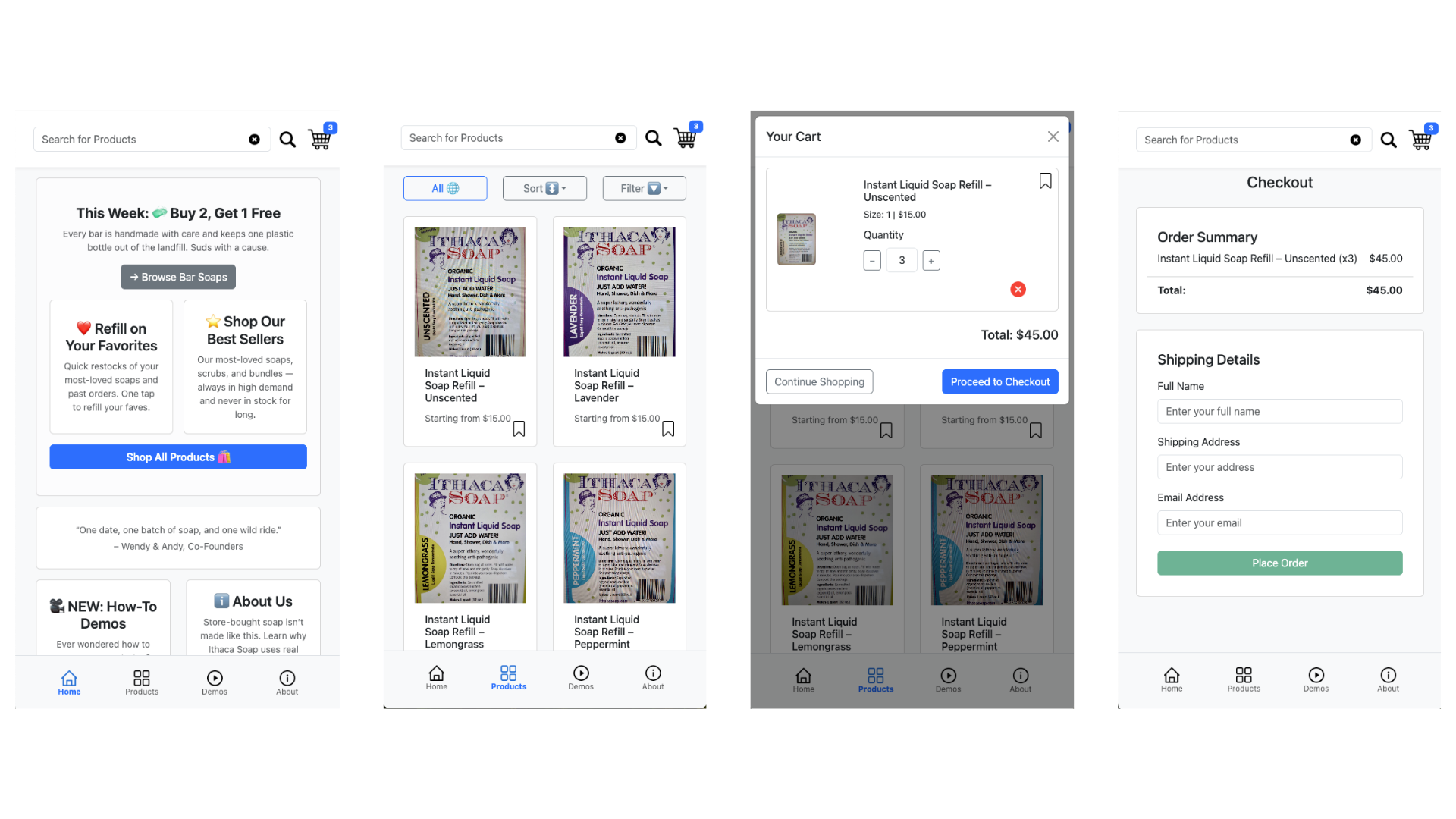 We began with stakeholder conversations to understand Ithaca Soap’s sustainability mission, business goals, and desire to evolve beyond their existing website into a more streamlined mobile experience. The client emphasized reducing plastic waste, promoting refillable products, and educating customers about multi-use applications