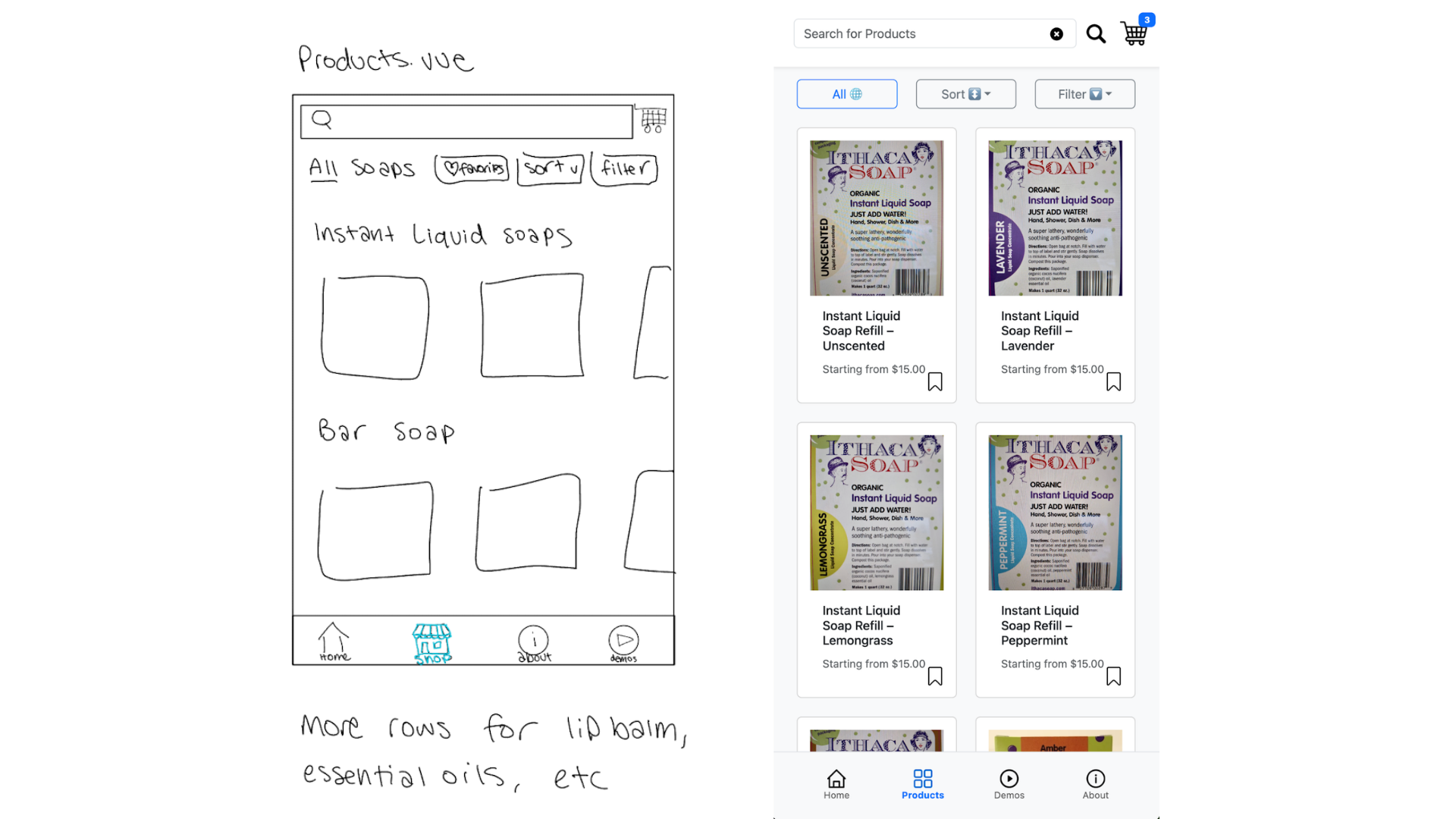 Ithaca Soap is a high-fidelity, mobile-first e-commerce prototype built in Vue.js for a local sustainable personal care company in Ithaca, NY. The client had an existing website but wanted to explore a more streamlined, app-like shopping experience optimized for mobile users.